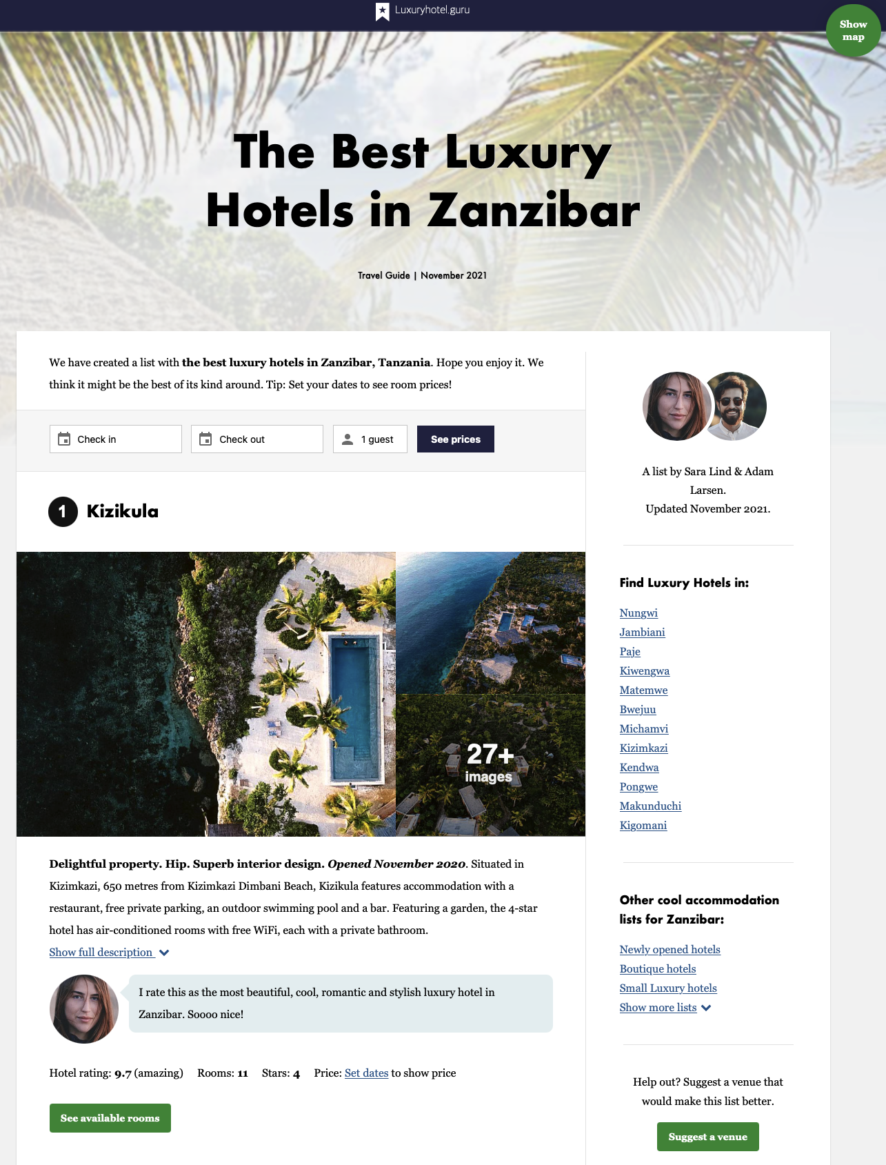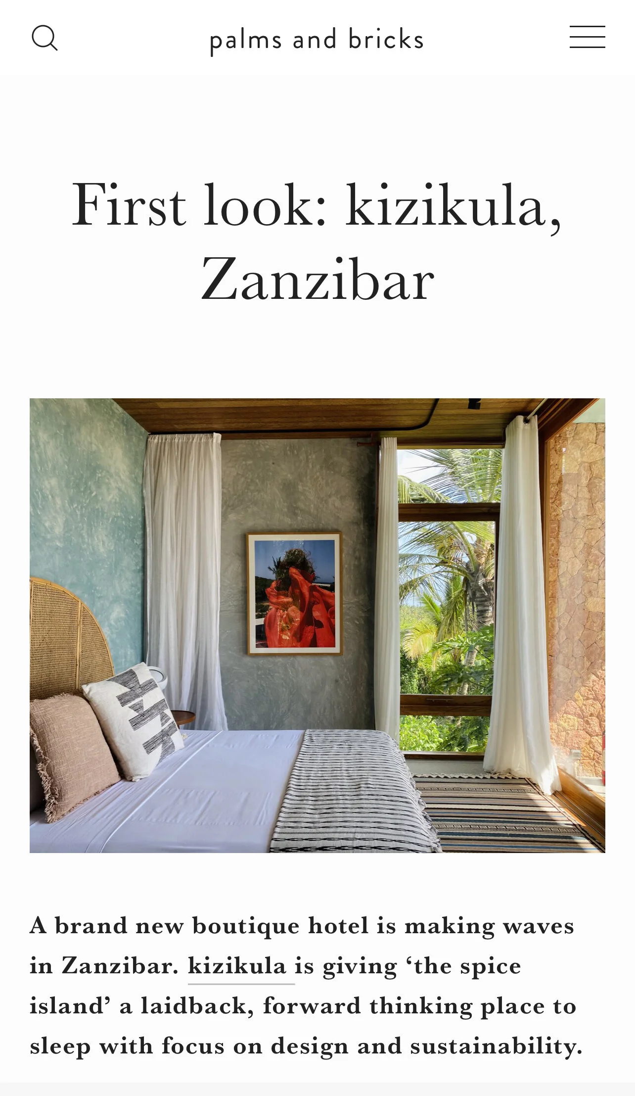 For those of us in Europe and North America, Zanzibar is impossibly exotic, not to mention far away. But kizikula, a boutique hotel on the Tanzanian island’s south coast, is as cosmopolitan as they come. It’s the work of a couple of friends from Dubai, one of whom has roots here on the island, and who, inspired by a lifetime of globe-trotting experience, brought in a Mumbai-based architecture studio and an Auckland-based landscape architect to help them realize a totally unique and totally unforgettable boutique hotel. - The Agenda - Tablet Hotels - The Hotel Experts at the Michelin Guide